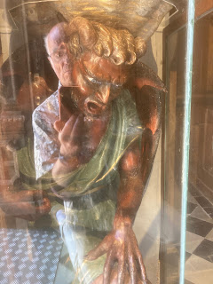 This image is one of the paintings from the Museum of the Petit Palais. It depicts two legends of St. Eloi, the patron saint of blacksmiths, who is kind of a patron saint for Richard. One legend has him tempted by the devil disguised as beautiful woman; he noticed her cloven hoofs and pinched her nose with hot tongs. The other legend has him shoeing a horse, that did not want to be shoed. He got frustrated, cut off the horse's leg, and then miraculously reattached it!